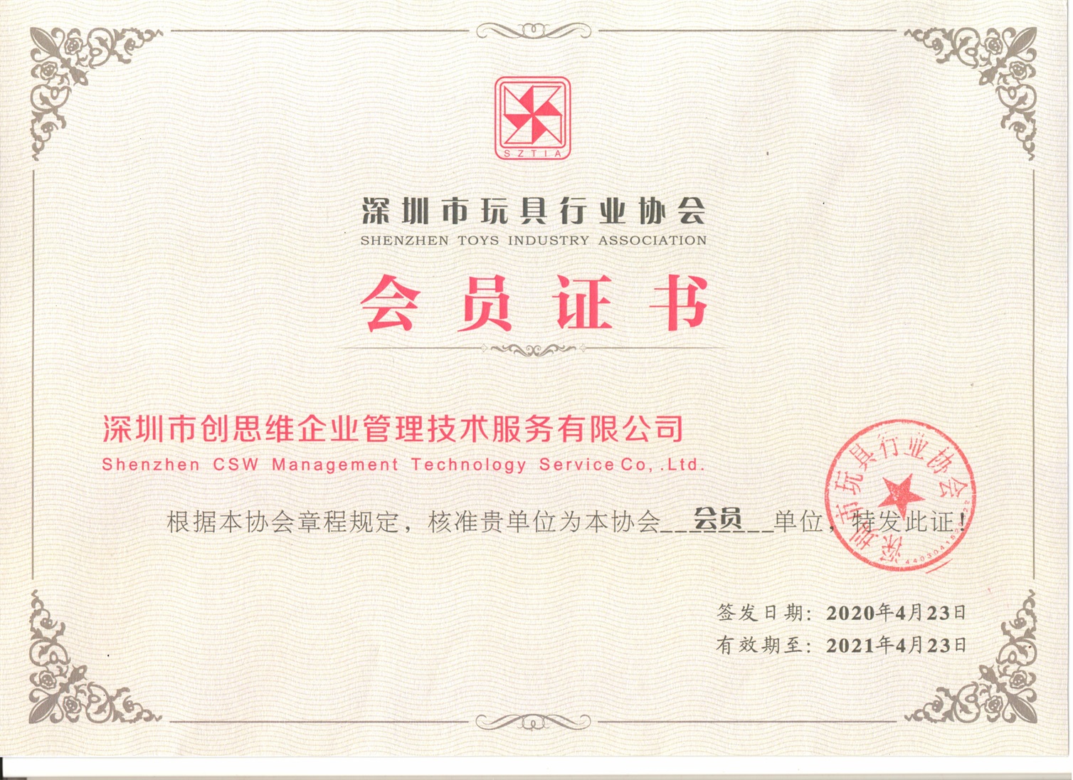 2020年玩具行業協會會員證書