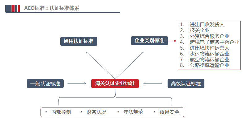 截至目前,《海關(guān)認(rèn)證企業(yè)標(biāo)準(zhǔn)》體系為“1+8”模式,即,通用標(biāo)準(zhǔn)加進(jìn)出口收發(fā)貨人、報(bào)關(guān)企業(yè)、外貿(mào)綜合服務(wù)企業(yè)、跨境電子商務(wù)平臺(tái)企業(yè)、進(jìn)出境快件運(yùn)營(yíng)人、水運(yùn)物流運(yùn)輸企業(yè)、航空物流運(yùn)輸企業(yè)、公路物流運(yùn)輸企業(yè)8個(gè)單項(xiàng)標(biāo)準(zhǔn)。
